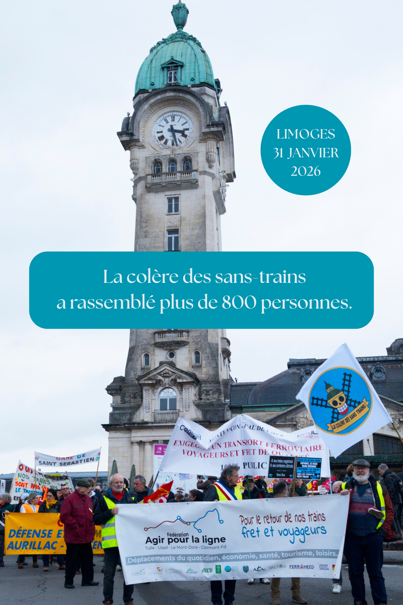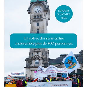 Le 31 janvier 2026, près de 800 personnes se sont rassemblée à la gare des Bénédictins à Limoges pour dénoncer le manque d’investissement dans le réseau ferroviaire des territoires ruraux de Nouvelle-Aquitaine, d’Auvergne et d’Occitanie et l’abandon des trains qui relient Angoulême, Limoges, Clermont, Guéret, Brive, Aurillac.